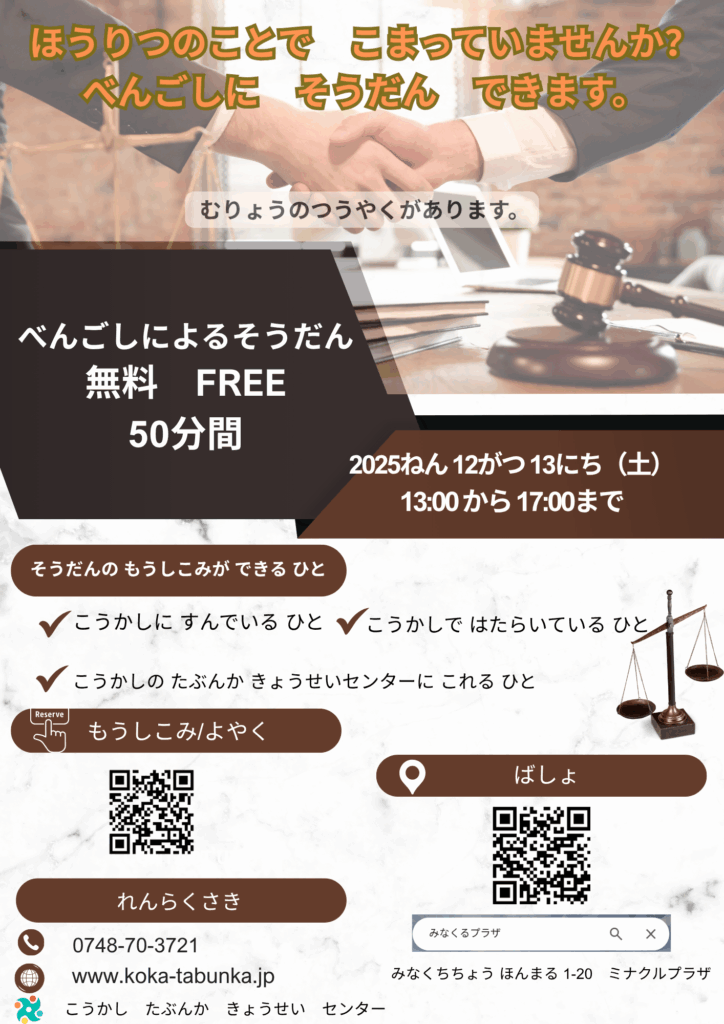 無料弁護士相談お気軽にご相談ください。 法律のことで困っていませんか?甲賀市多文化共生センターでは、弁護士による無料相談を実施します。通訳のサポートもありますので、日本語が苦手な方も安心してご利用いただけます。 日時:2025年12月 […]